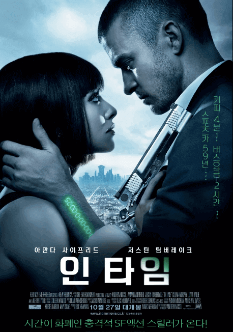 영화 인타임은 다소 개연성이 부족해 보이는 스토리적인 아쉬운 장면들이 있기는 했지만, 시간이 돈이 되는 미래 사회를 보여주며 빈부의 격차와 불평등한 시스템에 대한 날카로운 비판을 담고 있는 부분은 인상적이었습니다. 시간이 돈이 되는 미래 사회라는 참신한 소재였지만, 돌아보면 현재 우리는 돈을 벌기 위해 우리의 시간을 쓰고 있는데, 결국 순서만 다를 뿐 지금의 우리의 모습과 별반 다를 것도 없지 않을까 라는 생각을 하게 합니다.