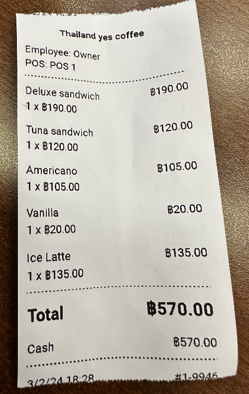 비행기 2시간 이상 지연되면 여행자보험에서 지연시간 동안 식사한 금액의 일부금액 보상해 준다고 했는데, 한국 돌아와서 알아보니 항공기 지연 관련해서는 출국편만 보상해 준다고 하는 슬픈 소식. 그걸 모르고 면세점 카페에서 샌드위치 2개랑 커피 2잔 구매했는데.. 태국 와서 식사로 가장 큰 금액인 570밧이 나왔다.(여행자보험 보상이 안되다니..ㅠㅠ) 이때는 아무것도 모르고 맛있게 먹었다:)