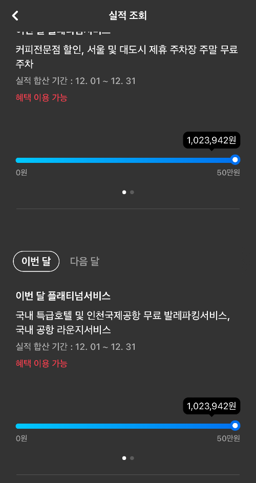(실적 기준을 충족한 경우라도 혜택별 잔여 이용 횟수 및 한도 보유 시에 한해 혜택이 제공됨/ 자세한 내용은 해당카드 고객센터로 문의)