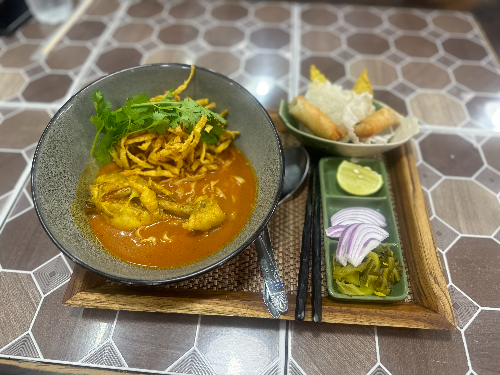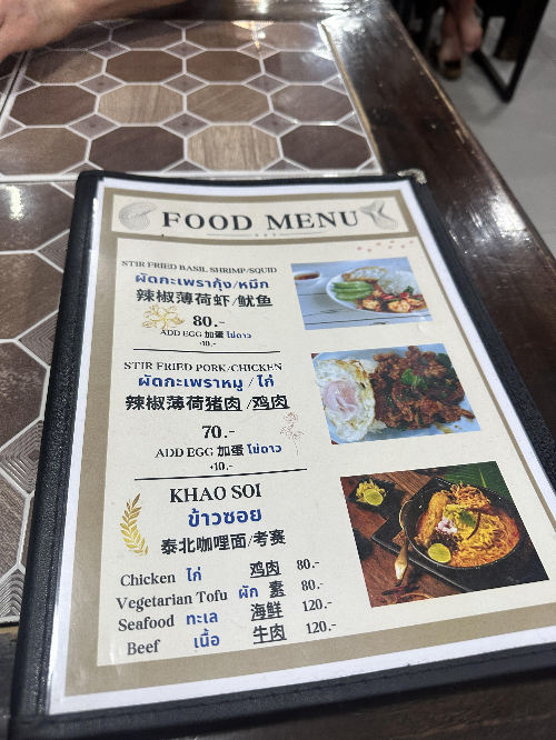 타페문을 향해서 거리를 걷다가 사람들이 많이 앉아있는 밥집으로 또 들어갔다.. 가서 카오소이와 포크덮밥을 시켰는데 두 메뉴 모두 만족스러웠다! 미리 찾아서 간 곳이 아니었고 돌아다니다가 즉흥적으로 들어간 거였는데 굿!