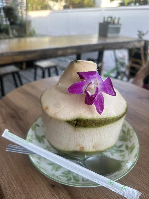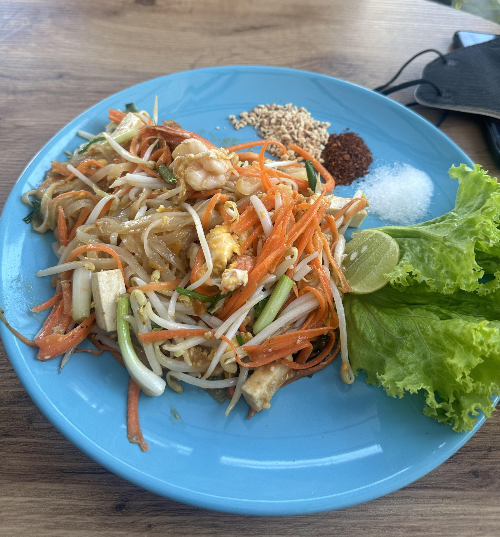 숙소에서 가벼운 옷으로 갈아입고 배가 너무 고파서 일단 뭐 좀 먹어야 할 거 같아서 나왔다. 처음에 가려고 했던 가게는 문이 닫아서 걷다가 괜찮아 보이는 곳으로 들어갔는데 야외분위기를 즐기며 치앙마이 도착을 기념할 수 있어서 좋았다. 인생 첫 생 코코넛 음료도 마시고ㅎㅎ나에겐 평양냉면 국물 같은 심심한 맛이었지만 이런 맛을 좋아하는 나로서는 만족스러웠다. 내가 사랑하는 팟타이도 태국현지에서 드디어 마주했다. 이후로 지겹도록 팟타이를 찾아 먹었다고 한다...