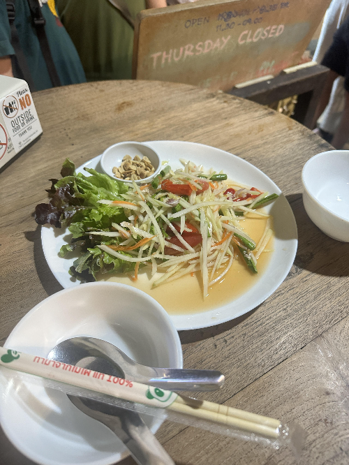 리뷰에는 메뉴들이 많이 늦게 나온다고 했는데 우리 메뉴는 적당히 기다릴만한 시간에 나왔다. 메뉴는 빤얌커리, 쏨땀, 팟타이로 주문했다. 밥을 먹고 나가는데 기다리고 있던 한국분이 어떠냐고 물어보셨다. 나는 말했다. "맛있긴 한데 저한테는 전체적으로 메뉴들이 좀 달았던 거 같아요." 그랬다. 전체적으로 메뉴들이 맛있었는데 달았다.